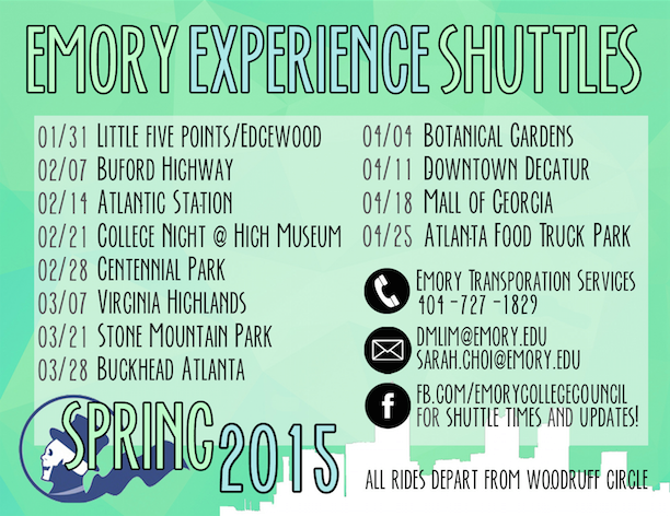 A great service provided to students are the experience shuttles which promote a different destination each weekend. Some popular destinations include; Atlantic Station, Stone Mountain, Mall of Georgia, and more. Best part is that these are free! The only catch is that they do run by a specific schedule, so don’t be that guy that forgets to catch the last shuttle and is stranded. Check out the Emory College Council’s Facebook page for published schedules: